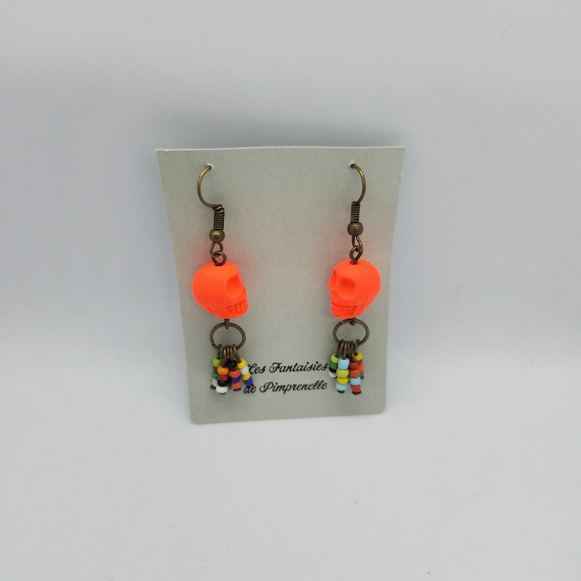 Ces boucles d'oreilles incroyables sont faites de perles tête de mort orange fluo qui révèleront votre côté obscur, et ornées de perles rocaille multicolore pour ajouter du pep's à votre style !