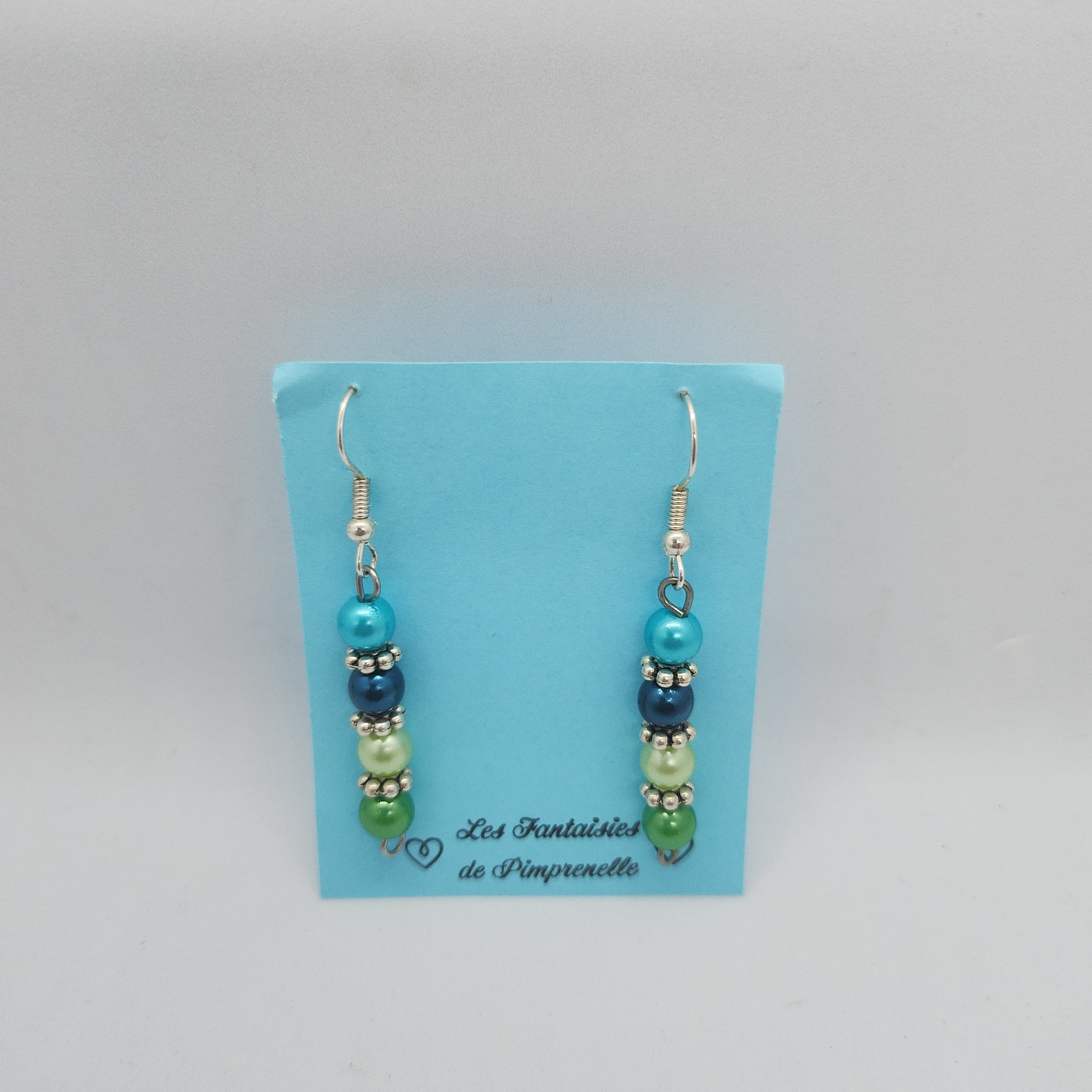 Ces boucles d'oreilles donneront une touche originale et colorée à vos tenues, avec leurs perles nacrées turquoise marine vert anis et vert ainsi que leurs perles argentées, le tout maintenu par des crochets en métal argentés.