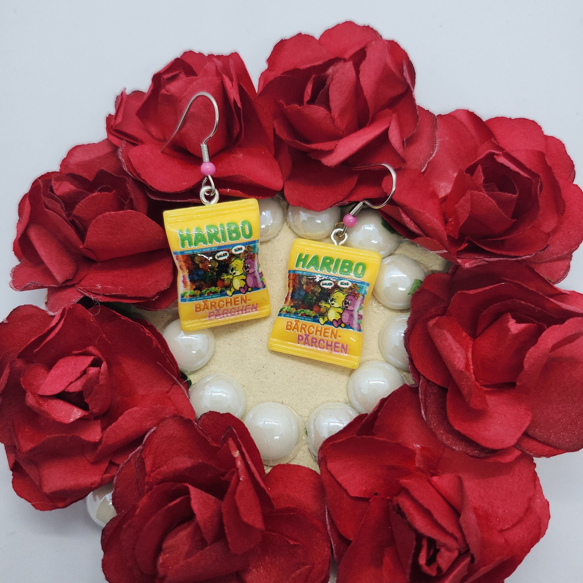 "Égayez vos tenues avec ces boucles d'oreilles Haribo jaunes et multicolores ! Les crochets en métal argentés ajoutent une touche élégante et les perles roses apportent une touche girly à ces accessoires amusants. Idéales pour mettre de la couleur dans votre vie (et à vos oreilles)!"
