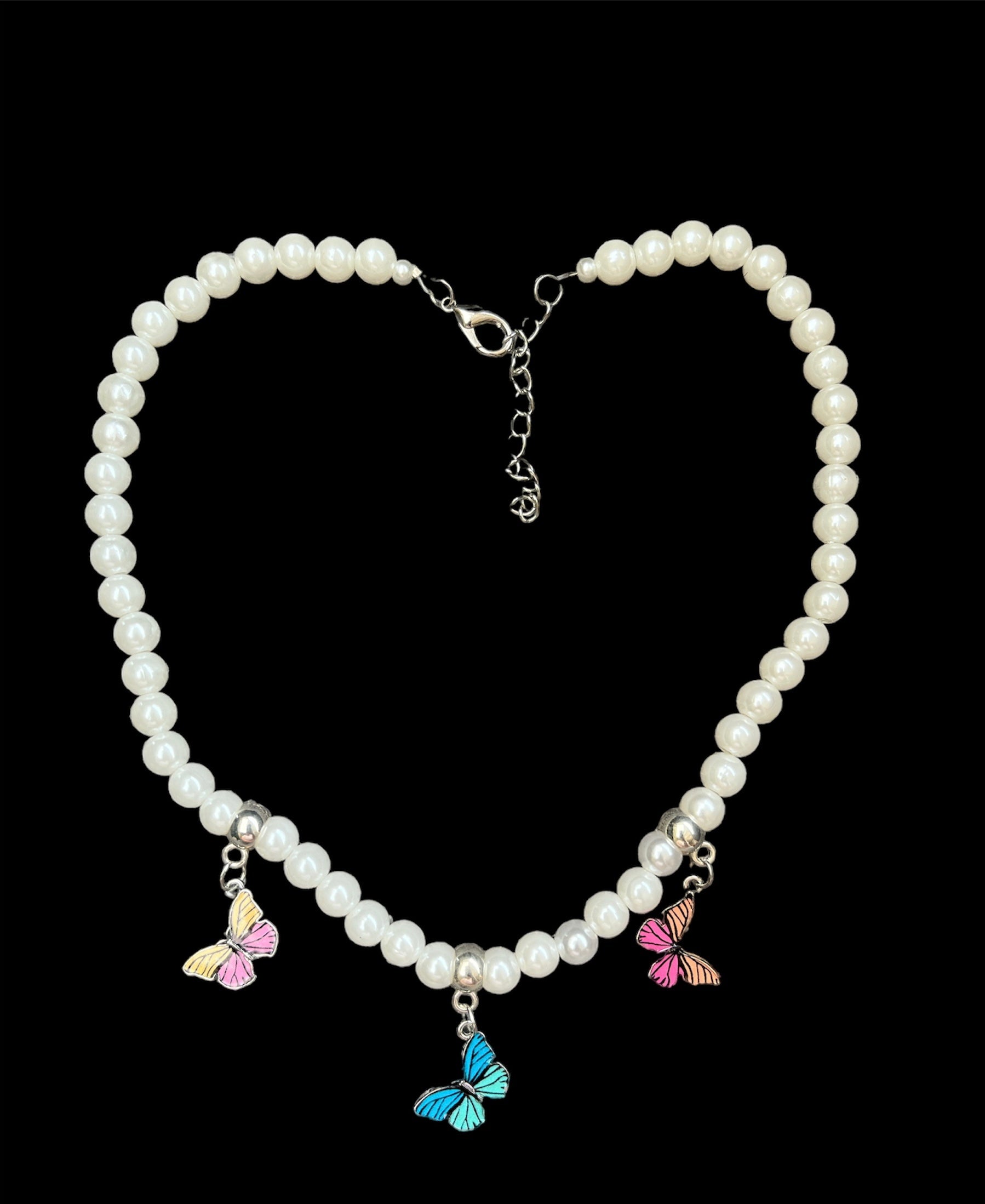 Un collier orné de perles nacrée blanche et des breloques papillons en métal argenté et multicolore, le tout parfaitement encadré par une chaine et un fermoir en métal argenté qui s'empareront de votre cou avec style et élégance.