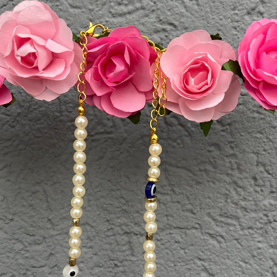 Notre collier chic est fabriqué à partir de perles nacrées crème, des perles œil bleues, blanches et noires et des perles dorées. La chaine et le fermoir sont en métal doré et sont ajustables de 38 à 51 cm. Un magnifique bijou pour compléter votre look.