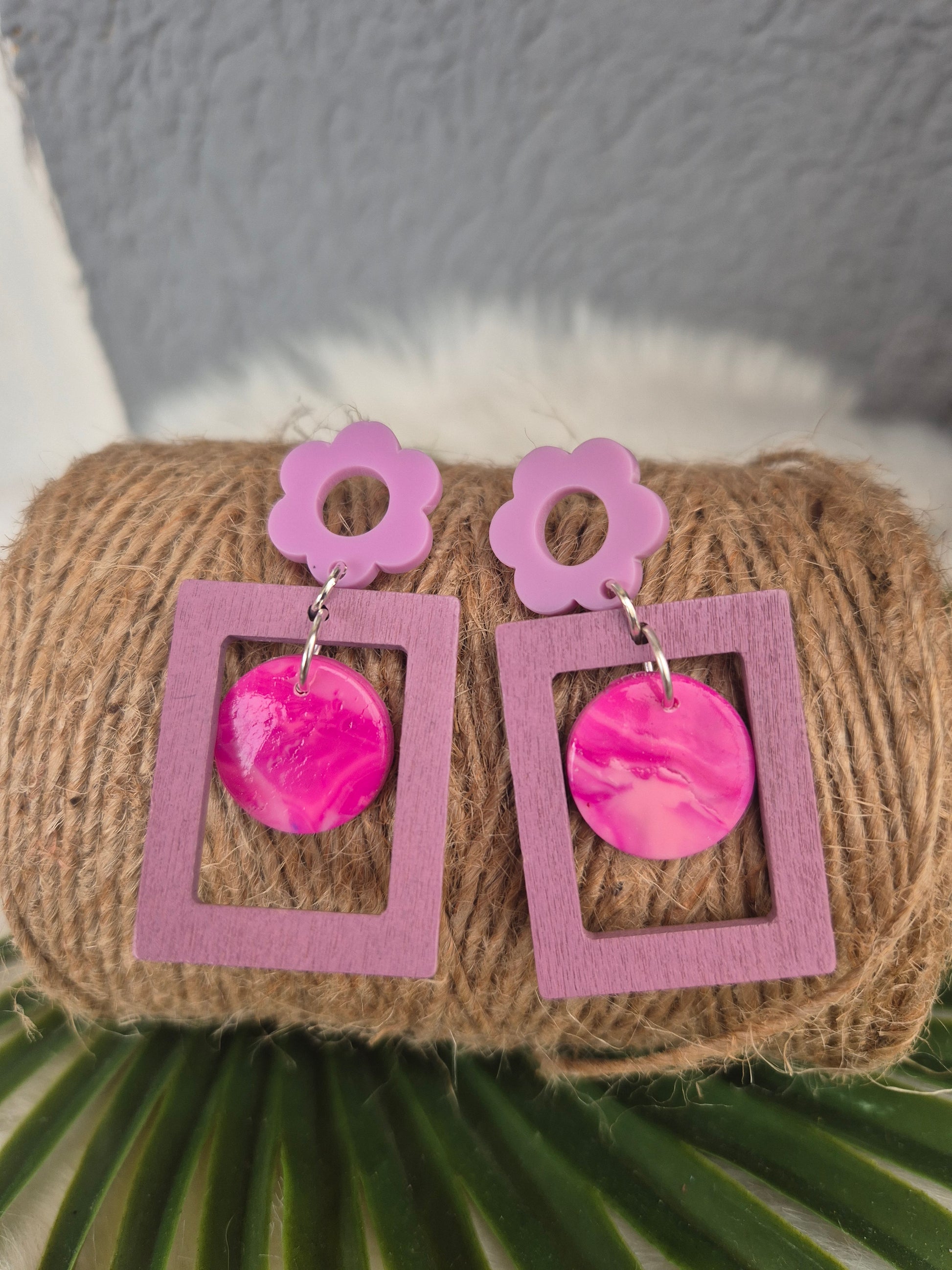 Les boucles d'oreilles arborent une esthétique charmante grâce à l'alliance de la pâte polymère rose et du bois violet clair.