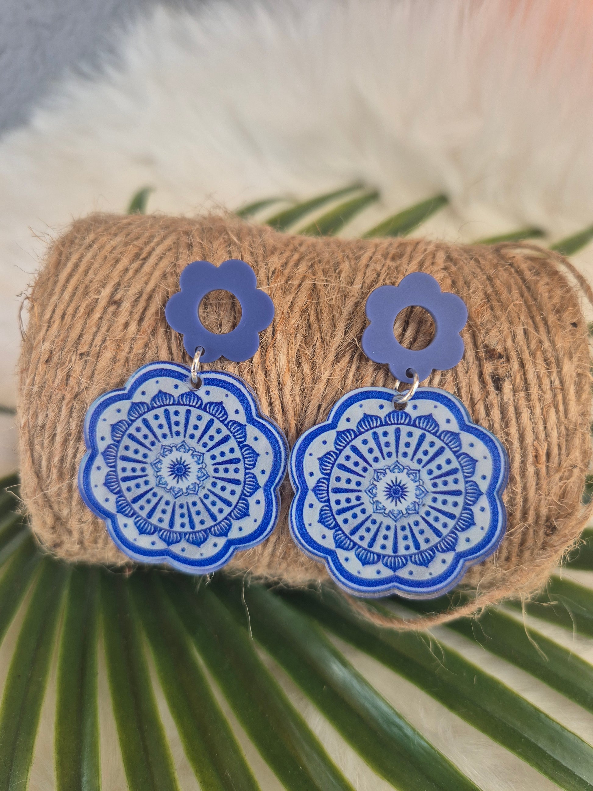 Ces boucles d'oreilles, ornées de plastique bleu et blanc, offrent une esthétique fraîche et estivale.